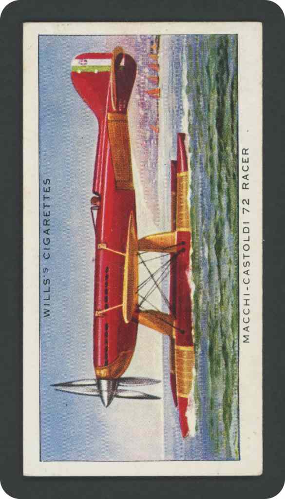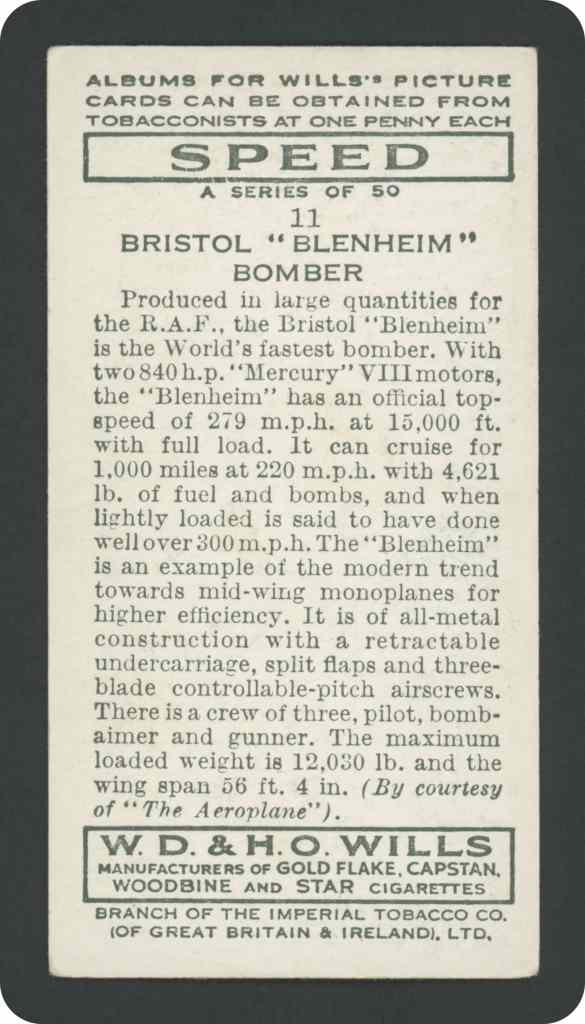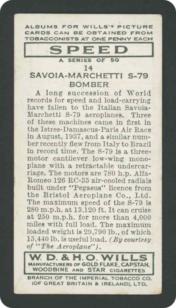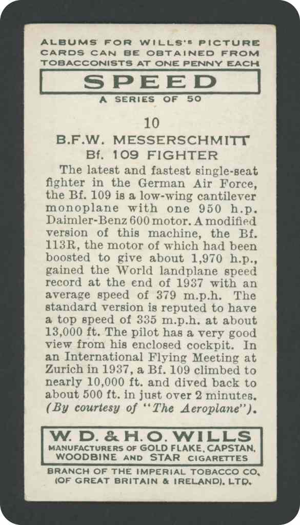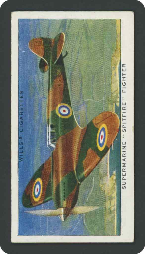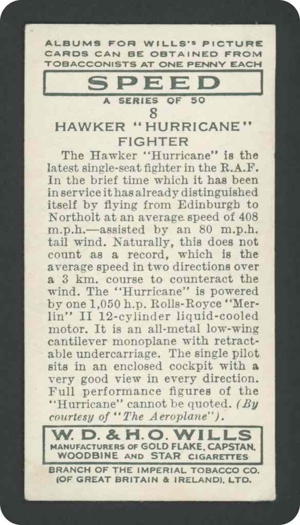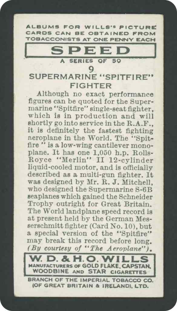 Although no exact performance figures can be quoted for the Super-marine “Spitfire” single-seat fighter, which is in production and will shortly go into service in the R.A.F., it is definitely the fastest fighting aeroplane in the World. The “Spit- fire” is a low-wing cantilever mono-plane. It has one 1,050 h.p. Rolls-Royce “Merlin’ II 12-cylinder liquid-cooled motor, and is officially described as a multi-gun fighter. It was designed by Mr. R. J. Mitchell, who designed the Supermarine S-6B seaplanes which gained the Schneider Trophy outright for Great Britain. The World landplane speed record is at present held by the German Messerschmitt fighter (Card No. 10), but a special version of the “Spitfire” may break this record before long. (By courtesy of “The Aeroplane”).