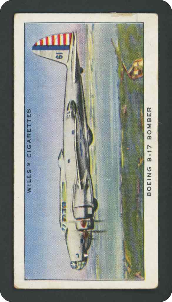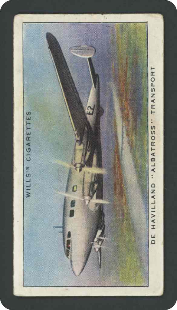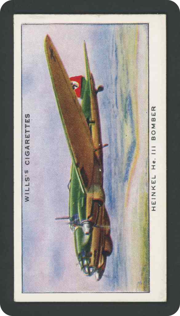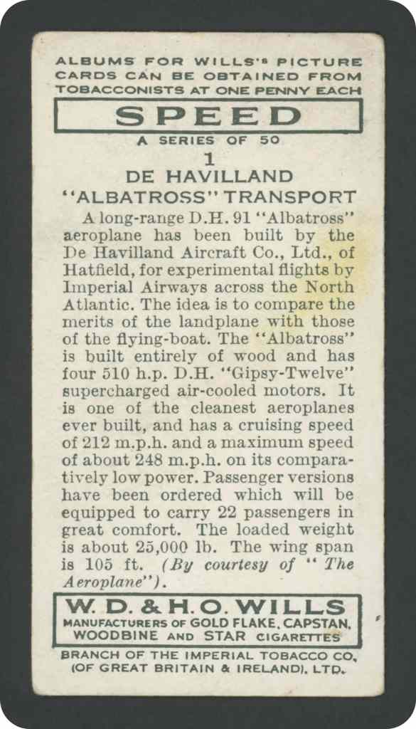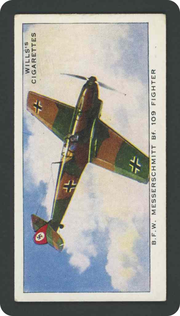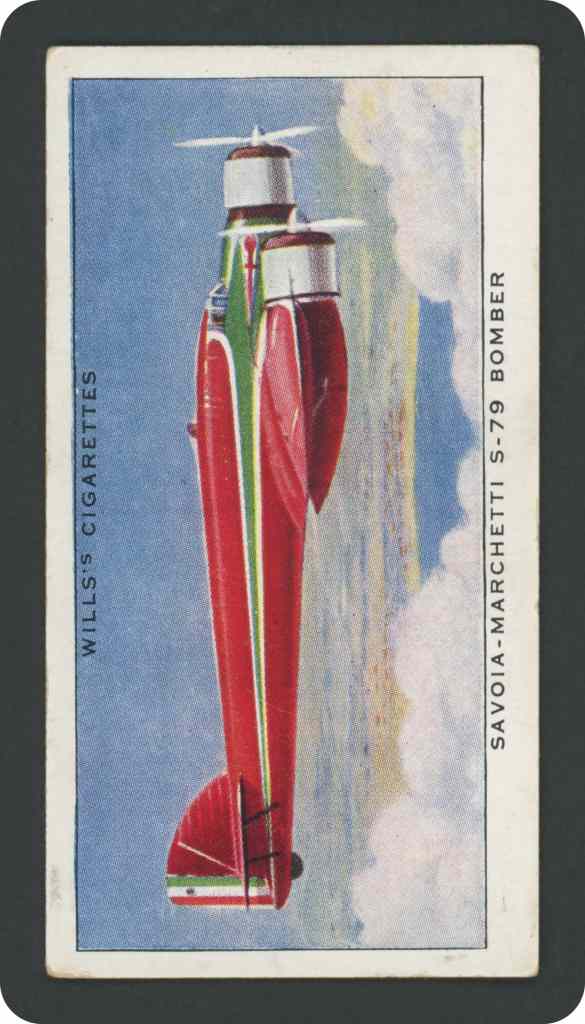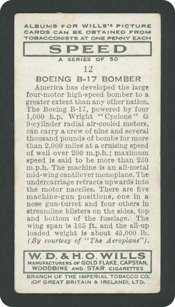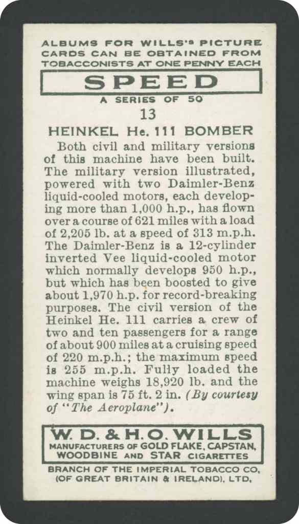 Although no exact performance figures can be quoted for the Super-marine “Spitfire” single-seat fighter, which is in production and will shortly go into service in the R.A.F., it is definitely the fastest fighting aeroplane in the World. The “Spit- fire” is a low-wing cantilever mono-plane. It has one 1,050 h.p. Rolls-Royce “Merlin’ II 12-cylinder liquid-cooled motor, and is officially described as a multi-gun fighter. It was designed by Mr. R. J. Mitchell, who designed the Supermarine S-6B seaplanes which gained the Schneider Trophy outright for Great Britain. The World landplane speed record is at present held by the German Messerschmitt fighter (Card No. 10), but a special version of the “Spitfire” may break this record before long. (By courtesy of “The Aeroplane”).