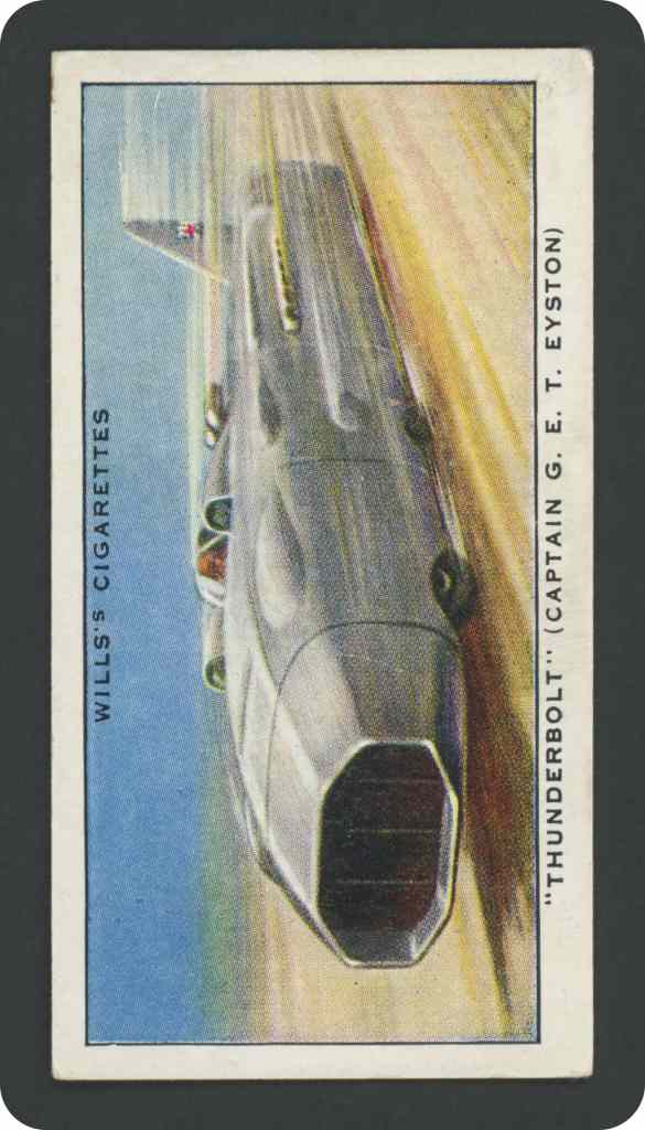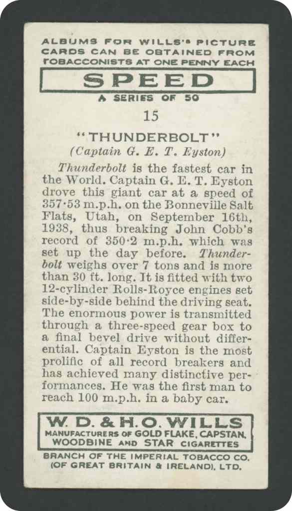 Thunderbolt is the fastest car in the World. Captain G. E. T. Eyston drove this giant car at a speed of 357:53 m.p.h. on the Bonneville Salt Flats, Utah, on September 16th, 1938, thus breaking John Cobb’s record of 350•2 m.ph. which was set up the day before. Thunderbolt weighs over 7 tons and is more than 30 ft. long. It is fitted with two 12-cylinder Rolls-Royce engines set side-by-side behind the driving seat. The enormous power is transmitted through a three-speed gear box to a final bevel drive without differ-ential. Captain Eyston is the most prolific of all record breakers and has achieved many distinctive per- formances. He was the first man to reach 100 m.p.h. in a baby car.