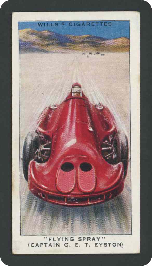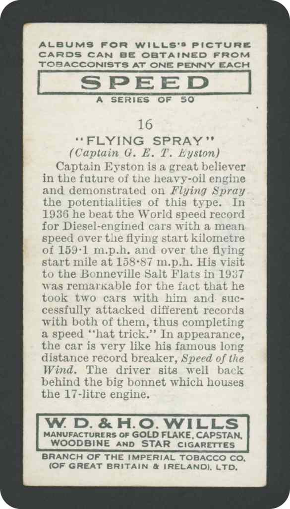 Captain Eyston is a great believer in the future of the heavy-oil engine and demonstrated on Flying Spray the potentialities of this type. In 1936 he beat the World speed record for Diesel-engined cars with a mean speed over the flying start kilometre of 1591 m.p.h. and over the flying start mile at 158•87 m.ph. His visit to the Bonneville Salt Flats in 1937 was remarkable for the fact that he took two cars with him and successfully attacked different records with both of them, thus completing a speed “hat trick.” In appearance, the car is very like his famous long distance record breaker, Speed of the Wind. The driver sits well back behind the big bonnet which houses the 17-litre engine.