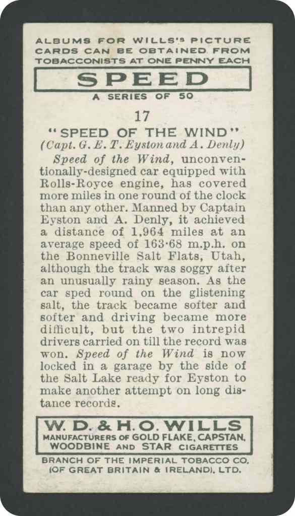Speed of the Wind, unconven-tionally-designed car equipped with Rolls-Royce engine, has covered more miles in one round of the clock than any other. Manned by Captain Eyston and A. Denly, it achieved a distance of 1,964 miles at an average speed of 163:68 m.ph. on the Bonneville Salt Flats, Utah, although the track was soggy after an unusually rainy season. As the car sped round on the glistening salt, the track became softer and softer and driving became more difficult, but the two intrepid drivers carried on till the record was won. Speed of the Wind is now locked in a garage by the side of the Salt Lake ready for Eyston to make another attempt on long distance records.
