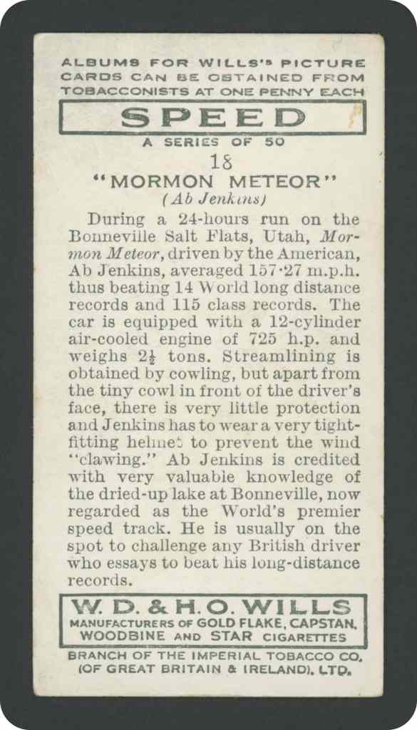 During a 24-hours run on the Bonneville Salt Flats, Utah, Mormon Meteor, driven by the American, Ab Jenkins, averaged 157•27 m.p.h. thus beating 14 World long distance records and 115 class records. The car is equipped with a 12-cylinder air- cooled engine of 725 hp. and weighs 2 tons. Streamlining is obtained by cowling, but apart from the tiny cowl in front of the driver’s face, there is very little protection and Jenkins has to wear a very tight-fitting helmet to prevent the wind “clawing.” Ab Jenkins is credited with very valuable knowledge of the dried-up lake at Bonneville, now regarded as the World’s premier speed track. He is usually on the spot to challenge any British driver who essays to beat his long-distance records.