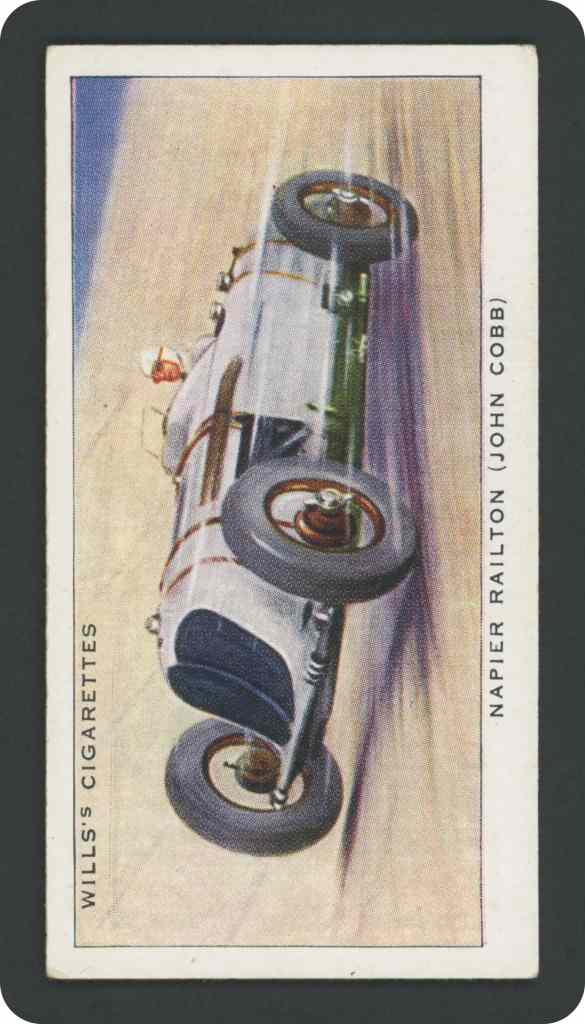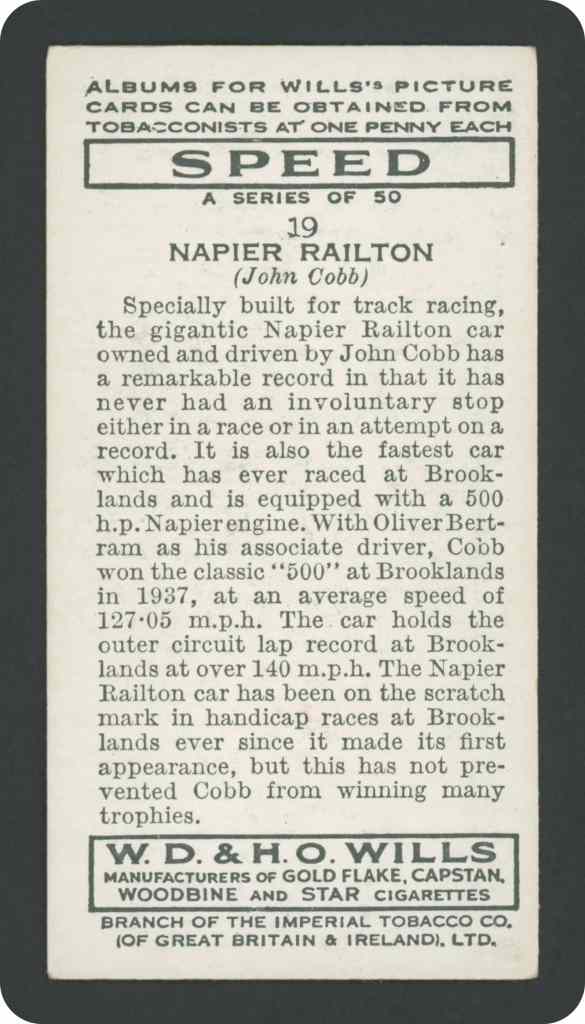 Specially built for track racing, the gigantic Napier Railton car owned and driven by John Cobb has a remarkable record in that it has never had an involuntary stop either in a race or in an attempt on a record. It is also the fastest car which has ever raced at Brook-lands and is equipped with a 500 h.p. Napierengine. With Oliver Bertram as his associate driver, Coob won the classic “500”‘ at Brooklands in 1937, at an average speed of 127.05 m.ph. The car holds the outer circuit lap record at Brook-lands at over 140 m.p.h. The Napier Railton car has been on the scratch mark in handicap races at Brook-lands ever since it made its first appearance, but this has not prevented Cobb from winning many trophies.