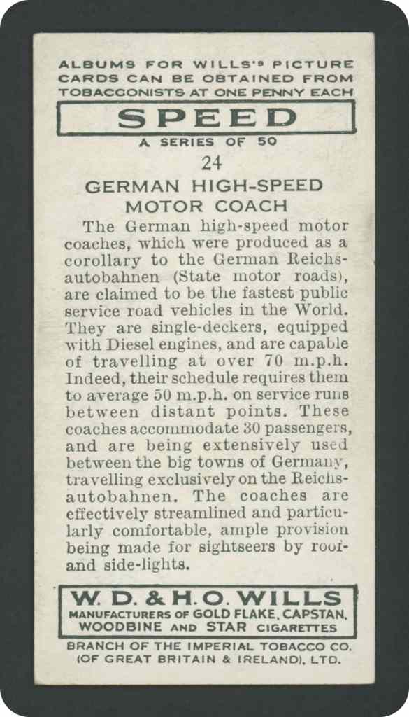 The German high-speed motor coaches, which were produced as a corollary to the German Reichs-autobahnen (State motor roads), are claimed to be the fastest public service road vehicles in the World. They are single-deckers, equipped with Diesel engines, and are capable of travelling at over 70 m.p.h. Indeed, their schedule requires them to average 50 m.p.h. on service runs between distant points. These coaches accommodate 30 passengers, and are being extensively used between the big towns of Germany, travelling exclusively on the Reichs-autobahnen. The coaches are effectively streamlined and particularly comfortable, ample provision being made for sightseers by rovi and side-lights.