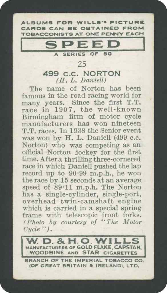 The name of Norton has been famous in the road racing world for many years. Since the first T.T. race in 1907, the well- known Birmingham firm of motor cycle manufacturers has won nineteen T.T. races. In 1938 the Senior event was won by H. L. Daniell (499 c.c. Norton) who was competing as an official Norton jockey for the first time. After a thrilling three-cornered race in which Daniell pushed the lap record up to 90•99 m.ph., he won the race by 15 seconds at an average speed of 89•11 m.ph. The Norton has a single-cylinder, single-port, overhead twin-camshaft engine which is carried in a special spring frame with telescopic front forks. (Photo by courtesy of “The Motor Cycle”).