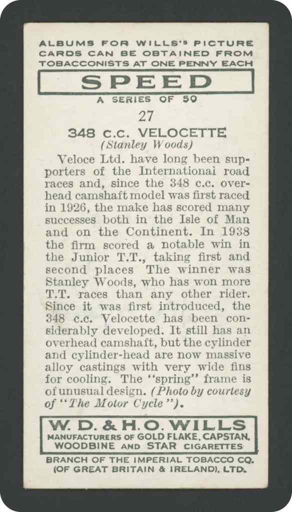 Veloce Ltd. have long been supporters of the Internationai road races and, since the 348 c.c. overhead camshaft model was first raced in 1926, the make has scored many successes both in the Isle of Man and on the Continent. In 1938 the firm scored a notable win in the Junior T.T., taking first and second places The winner was Stanley Woods, who has won more T.T. races than any other rider. Since it was first introduced, the 348 c.c. Velocette has been considerably developed. It still has an overhead camshaft, but the cylinder and cylinder-head are now massive alloy castings with very wide fins for cooling. The “spring” frame is of unusual design. (Photo by courtesy of “The Motor Cycle”).