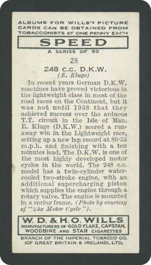 In recent years German D.K.W. machines have proved victorious in the lightweight class in most of the road races on the Continent, but it was not until 1938 that they achieved success over the arduous T.T. circuit in the Isle of Man. E. Kluge (D.K.W.) scored a runaway win in the Lightweight race, setting up a new lap record at 80•35 m.ph. and finishing with a ten minutes lead. The D.K.W. is one of the most highly developed motor cycles in the world. The 248 c.c. model has a twin- cylinder water-cooled two-stroke engine, with an additional supercharging piston which supplies the engine through a rotary valve. The engine is mounted in a spring frame. ( Photo by courtesy of “the Motor U’ycle “).
