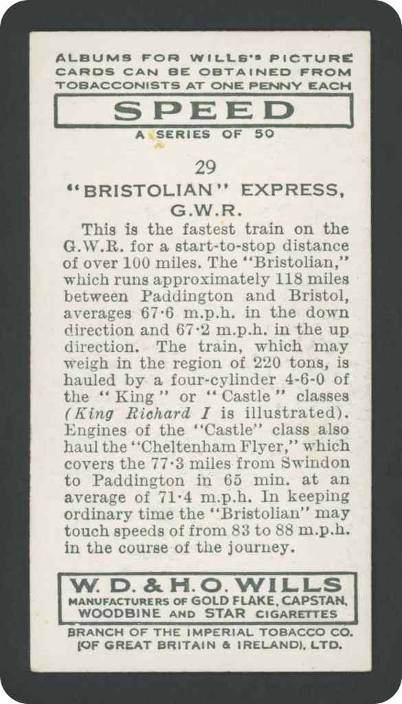 This is the fastest train on the G.W.R. for a start-to-stop distance of over 100 miles. The “Bristolian,” which runs approximately 118 miles between Paddington and Bristol, averages 67•6 m.ph. in the down direction and 67•2 m.p.h. in the up direction. The train, which may weigh in the region of 220 tons, is hauled by a four-cylinder 4-6-0 of the ” King ” or ” Castle” classes (King Richard I is illustrated). Engines of the “Castle” class also haul the “Cheltenham Flyer,” which covers the 77•3 miles from Swindon to Paddington in 65 min. at an average of 71•4 m.ph. In keeping ordinary time the “Bristolian” may touch speeds of from 83 to 88 m.p.h. in the course of the journey.