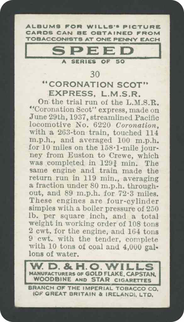On the trial run of the L.M.S.R. “Coronation Scot” express, made on June 29th, 1937, streamlined Pacific locomotive No. 6220 Coronation, with a 263-ton train, touched 114 m.p.h., and averaged 100 m.p.h. for 10 miles on the 158•1-mile journey rom Euston to Crewe, which was completed in 129} min. The same engine and train made the return run in 119 min., averaging a fraction under 80 m.p.h. through-out, and 89 m.p.h. for 72•3 miles. These engines are four-cylinder simples with a boiler pressure of 250Ib. per square inch, and a total weight in working order of 108 tons 2 cwt. for the engine, and 164 tons 9 cwt. with the tender, complete with 10 tons of coal and 4,000 gal lons of water.