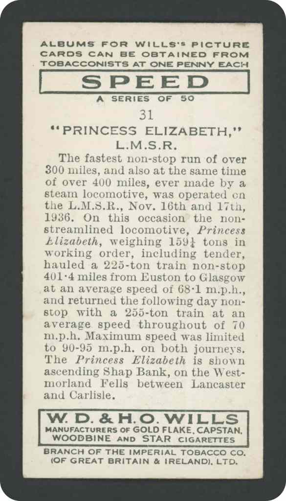 The fastest non-stop run of over 300 miles, and also at the same time of over 400 miles, ever made by a steam locomotive, was operated on the L.M.S.R., Nov. 16th and 17th, 1936. On this occasion the non-streamlined locomotive, Princess Elizabeth, weighing 159½ tons in working order, including tender, hauled a 225-ton train non-stop 401•4 miles from Euston to Glasgow at an average speed of 68•1 m.ph., and returned the following day nonstop with a 255-ton train at an average speed throughout of 70 m.p.h. Maximum speed was limited to 90-95 m.ph. on both journeys. The Princess Elizabeth is shown ascending Shap Bank, on the West-morland Fells between Lancaster and Carlisle.