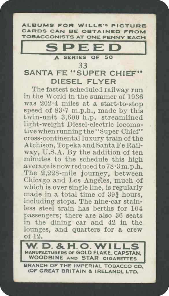 The fastest scheduled railway run in the World in the summer of 1936 was 202•4 miles at a start-to-stop speed of 83:7 m.ph., made by this twin-unit 3,600 h.p. streamlined light-weight Diesel-electric locomotive when running the “Super Chief’ cross- continental luxury train of the Atchison, Topeka and Santa Fe Rail-way, U.S.A. By the addition of ten minutes to the schedule this high average is now reduced to 78•3m.p.h. The 2,228-mile journey, between Chicago and Los Angeles, much of which is over single line, is regularly made in a total time of 391 hours, including stops. The nine-car stainless steel train has berths for 104 passengers; there are also 36 seats in the dining car and 42 in the lounges, and quarters for a crew of 12.