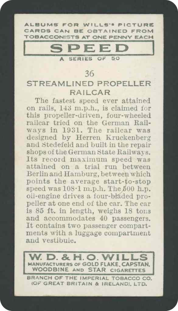 The fastest speed ever attained on rails, 143 m.p.h., is claimed for this propeller-driven, four-wheeled railcar tried on the German Railways in 1931. The railcar was designed by Herren Kruckenberg and Stedefeld and built in the repair shops of the German State Railways. Its record maximum speed was attained on a trial run between Berlin and Hamburg, between which points the average start-to-stop speed was 108•1 m.p.h. The 500 h.p. oil-engine drives a four-bladed propeller at one end of the car. The car is 85 ft. in length, weighs 18 tons and accommodates 40 passengers. It contains two passenger compartments with a luggage compartment and vestibule.