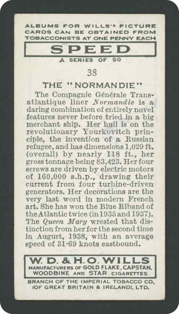 The Compagnie Générale Trans-atlantique liner Normandie is a daring combination of entirely novel features never before tried in a big merchant ship. Her hull is on the revolutionary Yourkovitch prin-ciple, the invention of a Russian refugee, and has dimensions 1,029 ft. (overall) by nearly 118 ft., . her gross tonnage being 83,423. Her four serews are driven by electric motors of 160,000 s.h.p., drawing their current from four turbine-driven generators. Her decorations are the very last word in modern French art. She has won the Blue Riband of the Atlantic twice (in 1935 and 1937). The Queen Mary wrested that distinction from her for the second time in August, 1938, with an average speed of 31•69 knots eastbound.