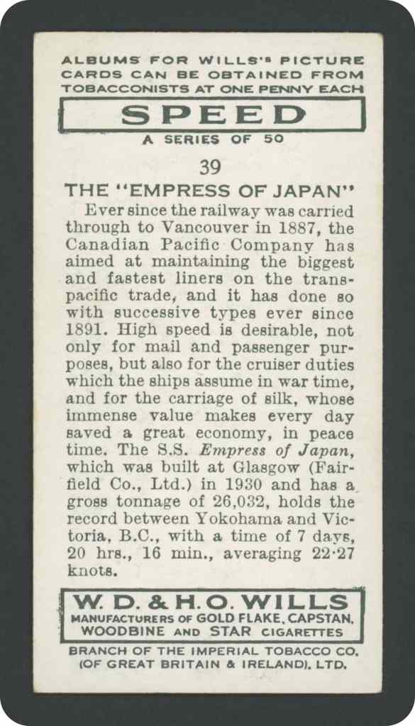Ever since the railway was carried through to Vancouver in 1887, the Canadian Pacific Company has aimed at maintaining the biggest and fastest liners on the trans-pacific trade, and it has done 80 with successive types ever since 1891. High speed is desirable, not only for mail and passenger pur-poses, but also for the cruiser duties which the ships assume in war time, and for the carriage of silk, whose immense value makes every day saved a great economy, in peace time. The S.S. Empress of Japan, which was built at Glasgow (Fair-field Co., Ltd.) in 1930 and has a gross tonnage of 26,032, holds the record between Yokohama and Vic-toria, B.C., with a time of 7 days, 20 hrs., 16 min., , averaging 22•27 knots.
