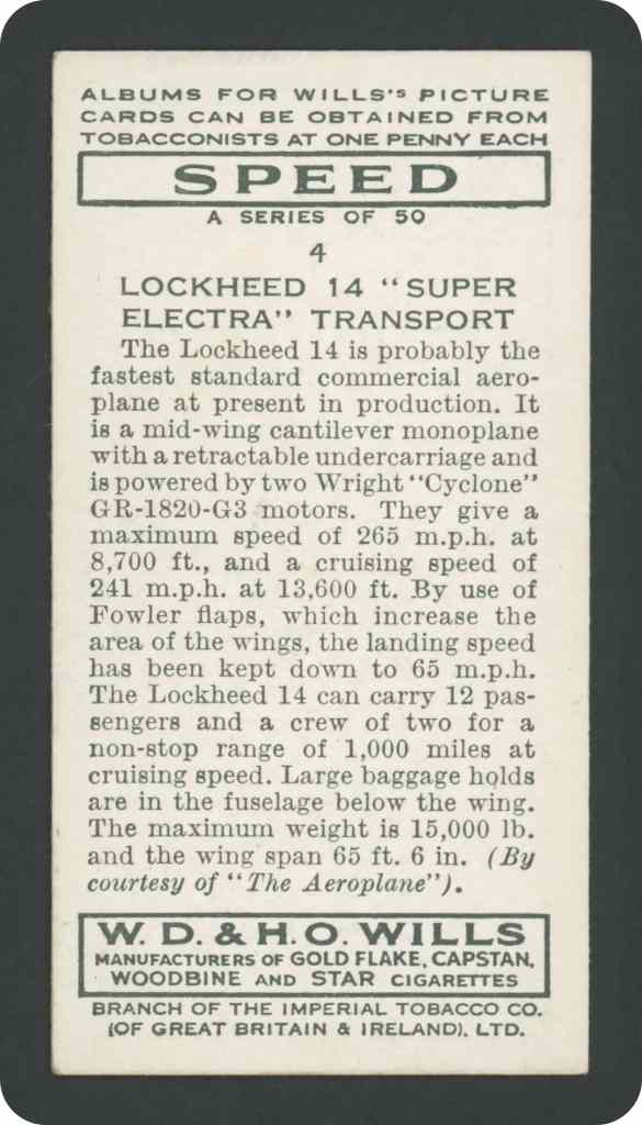 The Lockheed 14 is probably the fastest standard commercial aero-plane at present in production. It is a mid-wing cantilever monoplane with a retractable undercarriage and is powered by two Wright “Cyclone” GR-1820-G3 motors. They give a maximum speed of 265 m.ph. at 8,700 ft., and a cruising speed of 241 m.p.h. at 13,600 ft. By use of Fowler flaps, which increase the area of the wings, the landing speed has been kept down to 65 m.p.h. The Lockheed 14 can carry 12 passengers and a crew of two for a non-stop range of 1,000 miles at cruising speed. Large baggage holds are in the fuselage below the wing. The maximum weight is 15,000 lb. and the wing span 65 ft. 6 in. (By courtesy of ” The Aeroplane”).
