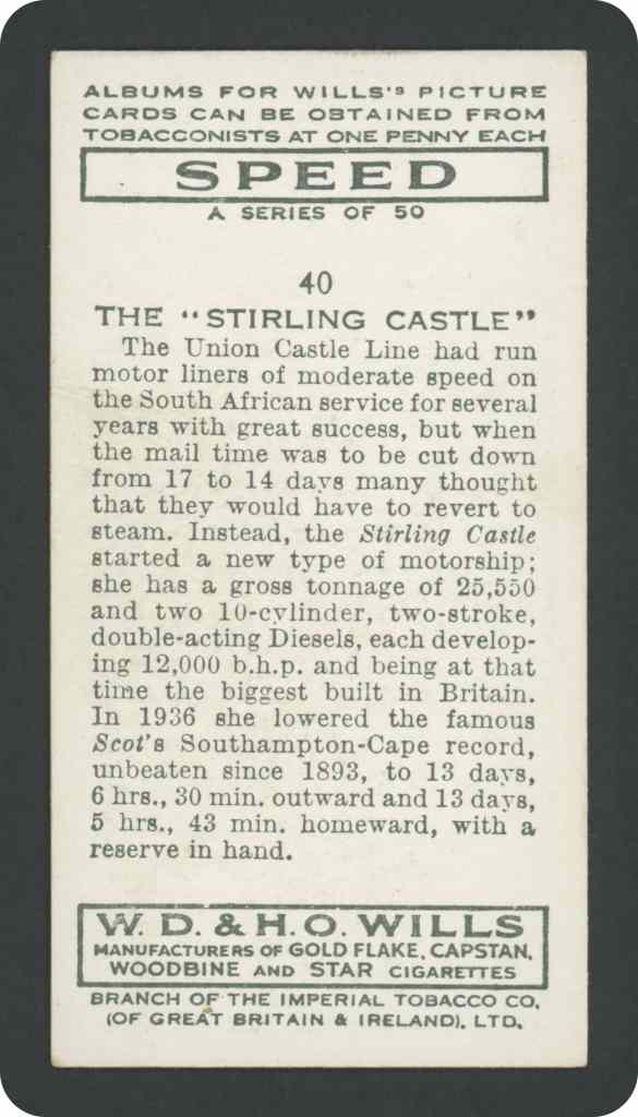 The Union Castle Line had run motor liners of moderate speed on the South African service for several years with great success, but when the mail time was to be cut down from 17 to 14 days many thought that they would have to revert to steam. Instead, the Stirling Castle started a new type of motorship; she has a gross tonnage of 25,550 and two 10-cylinder, two-stroke, double-acting Diesels, each developing 12,000 b.h.p. and being at that time the biggest built in Britain. In 1936 she lowered the famous Scot’s Southampton-Cape record, unbeaten since 1893, to 13 days, 6 hrs., 30 min. outward and 13 days, 5 hrs., 43 min. homeward, with a reserve in hand.