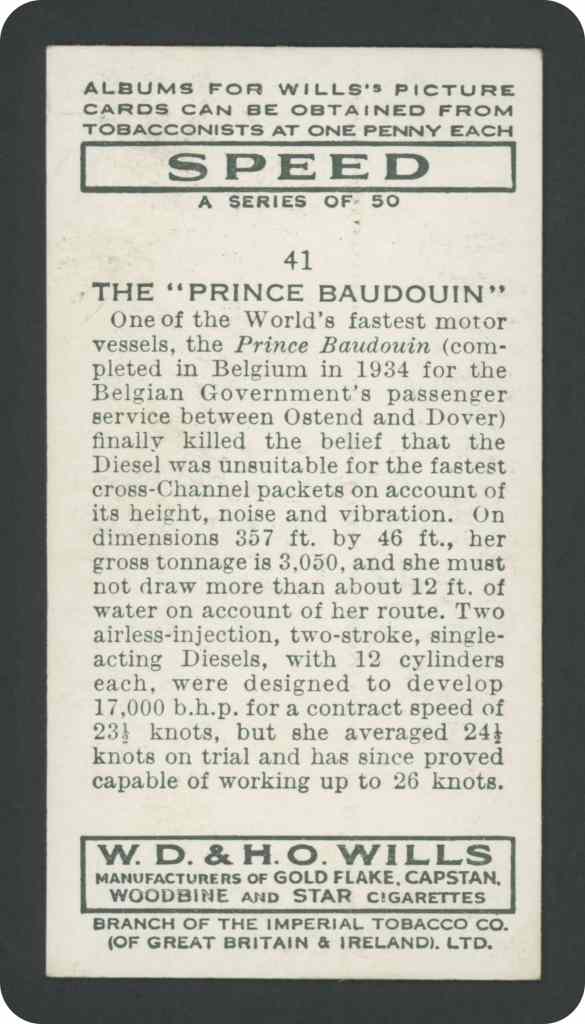 One of the World’s fastest motor vessels, the Prince Baudouin (com-pleted in Belgium in 1934 for the Belgian Government’s passenger service between Ostend and Dover) finally killed the belief that the Diesel was unsuitable for the fastest cross- Channel packets on account of its height, noise and vibration. On dimensions 357 ft. by 46 ft., her gross tonnage is 3,050, and she must not draw more than about 12 ft. of water on account of her route. Two airless-injection, two-stroke, single-acting Diesels, with 12 cylinders each, were designed to develop 17,000 b.h.p. for a contract speed of 231 knots, but she averaged 24% knots on trial and has since proved capable of working up to 26 knots.