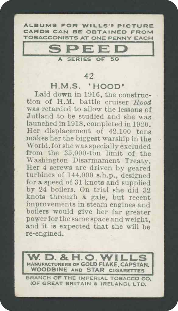 Laid down in 1916, the construc tion of H.M. battle cruiser Hood was retarded to allow the lessons of Jutland to be studied and she was launched in 1918, completed in 1920. Her displacement of 42,100 tons makes her the biggest warship in the World, for she was specially excluded from the 35,000-ton limit of the Washington Disarmament Treaty. Her 4 screws are driven by geared turbines of 144.000 s.h.p., , designed for a speed of 31 knots and supplied by 24 boilers. On trial she did 32 knots through a gale, but recent improvements in steam engines and boilers would give her far greater power for the same space and weight, and it is expected that she will be re-engined.