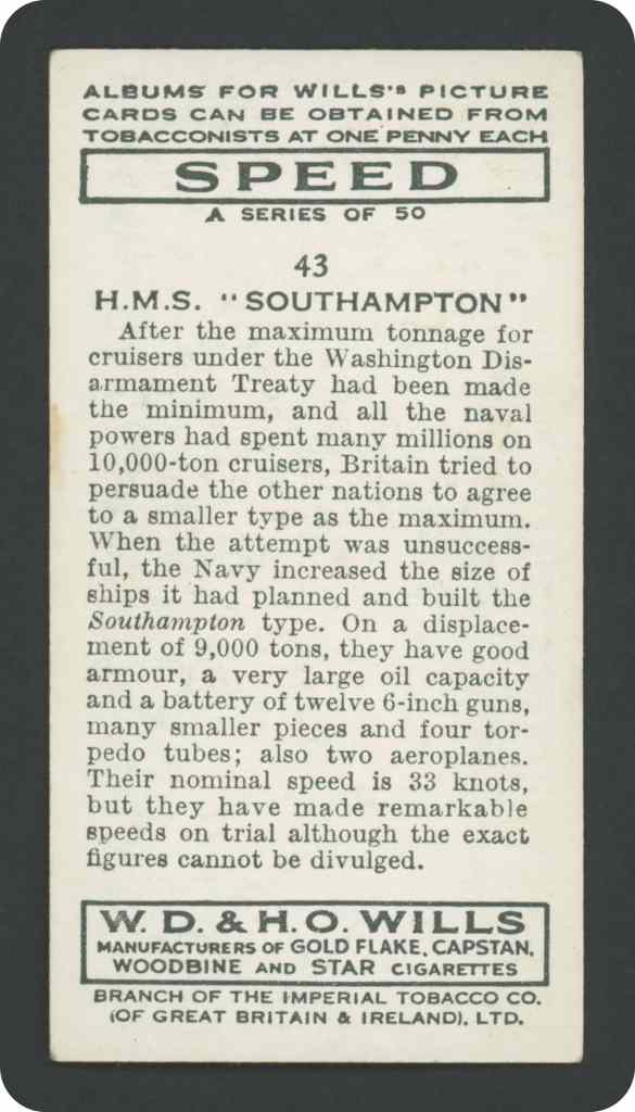 After the maximum tonnage for cruisers under the Washington Disarmament Treaty had been made the minimum, and all the naval powers had spent many millions on 10,000-ton cruisers, Britain tried to persuade the other nations to agree to a smaller type as the maximum. When the attempt was unsuccess-ful, the Navy increased the size of ships it had planned and built the Southampton type. On a displacement of 9,000 tons, they have good armour, a very large oil capacity and a battery of twelve 6-inch guns, many smaller pieces and four torpedo tubes; also two aeroplanes. Their nominal speed is 33 knots, but they have made remarkable speeds on trial although the exact figures cannot be divulged.