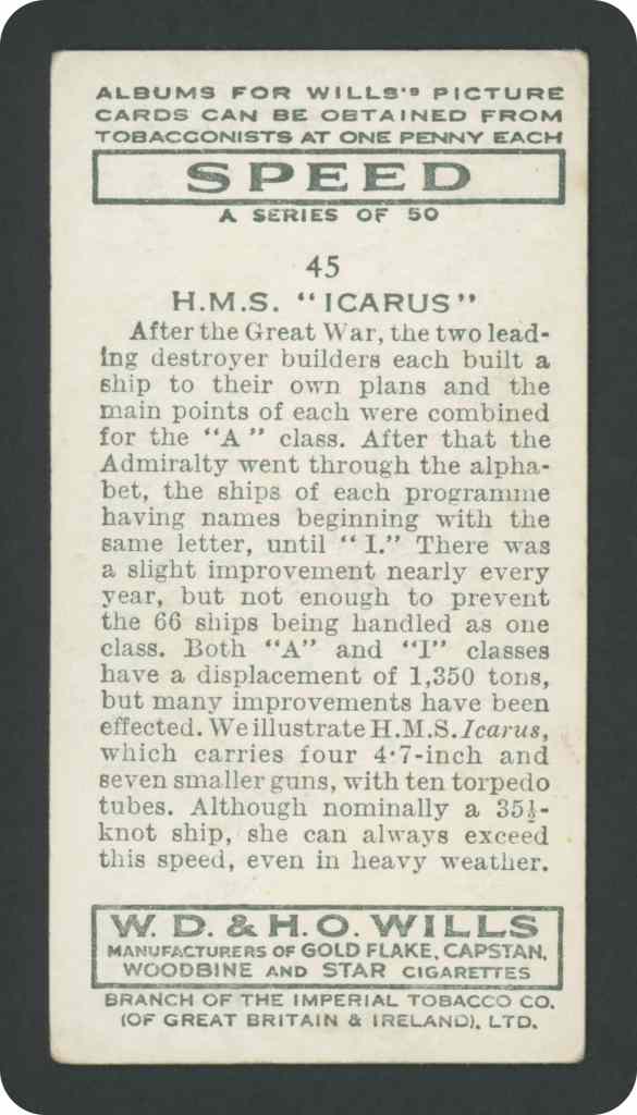 After the Great War, the two leading destroyer builders each built a ship to their own plans and the main points of each were combined for the “A ” class. After that the Admiralty went through the alpha-bet, the ships of each programme having names beginning with the same letter, until “I.” There was a slight improvement nearly every year, but not enough to prevent the 66 ships being handled as one class. Both “A” and “I’ classes have a displacement of 1,350 tons, but many improvements have been effected. Weillustrate H.M.S. Icarus, which carries four 47-inch and seven smaller guns, with ten torpedo tubes. Although nominally a 351-knot ship, she can always exceed this speed, even in heavy weather.