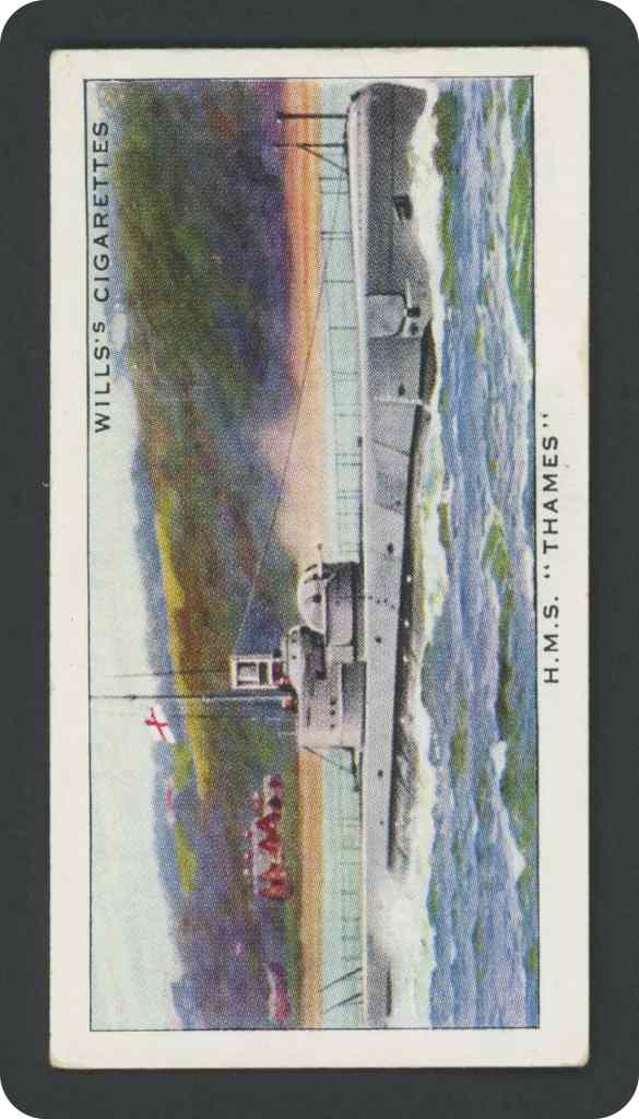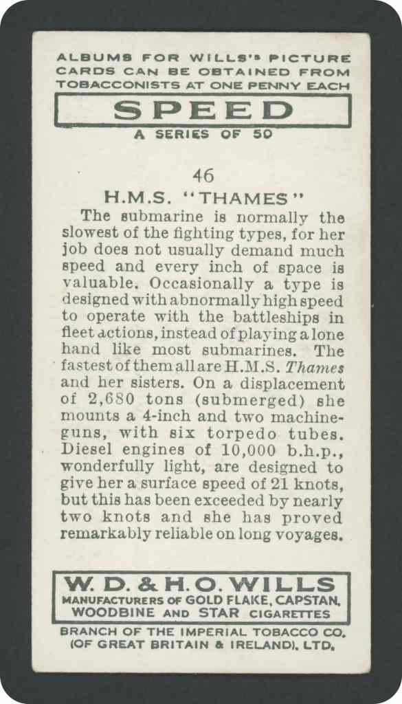 The submarine is normally the slowest of the fighting types, for her job does not usually demand much speed and every inch of space is valuable. Occasionally a type is designed with abnormally high speed to operate with the battleships in fleet actions, instead of playing a lone hand like most submarines. The fastest of them all are H.M.S. Thames and her sisters. On a displacement of 2,680 tons (submerged) she mounts a 4-inch and two machine-guns, with six torpedo tubes. Diesel engines of 10,000 b.h.p., wonderfully light, are designed to give her a surface speed of 21 knots, but this has been exceeded by nearly two knots and she has proved remarkably reliable on long voyages.