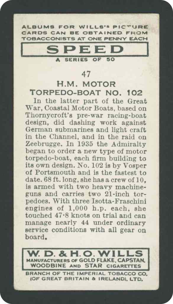 In the latter part of the Great War, Coastal Motor Boats, based on Thornycroft’s pre-war racing-boat design, did dashing work against German submarines and light craft in the Channel, and in the raid on Zeebrugge. In 1935 the Admiralty began to order a new type of motor torpedo-boat, each firm building to its own design. No. 102 is by Vosper of Portsmouth and is the fastest to date. 68 ft. long, she has a crew of 10, is armed with two heavy machine-guns and carries two 21-inch tor-pedoes. With three Isotta-Fraschini engines of 1,000 h.p. each, she touched 47•8 knots on trial and can manage nearly 44 under ordinary service conditions with all gear on board.