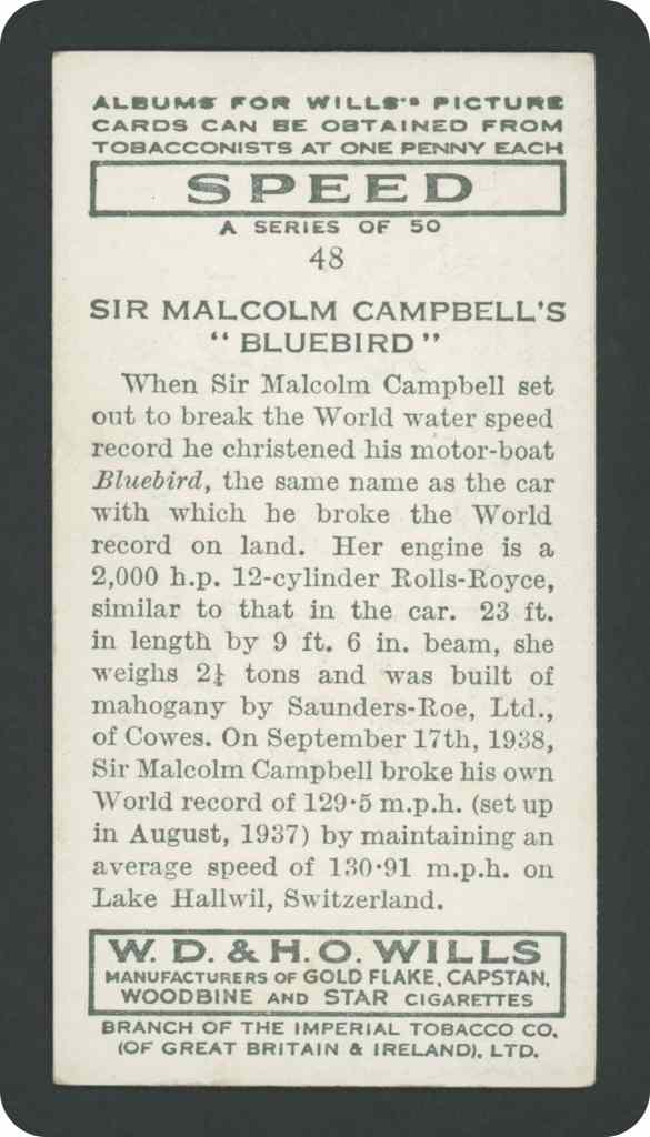 When Sir Malcolm Campbell set out to break the World water speed record he christened his motor-boat Bluebird, the same name as the car with which he broke the World record on land. Her engine is a 2,000 h.. 12-cylinder Rolls-Royce, similar to that in the car. 23 ft. in length by 9 ft. 6 in. beam, she weighs 2⅓ tons and was built of mahogany by Saunders-Roe, Ltd., of Cowes. On September 17th, 1938, Sir Malcolm Campbell broke his own World record of 129•5 m.p.h. (set up in August, 1937) by maintaining an average speed of 130•91 m.p.h. on Lake Hallwil, Switzerland.