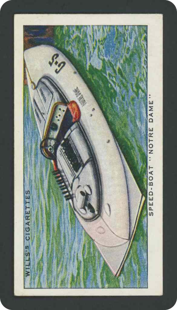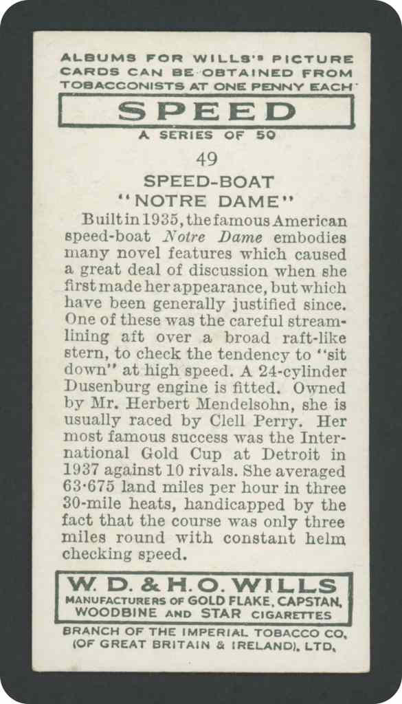 Built in 1935, the famous American speed-boat Notre Dame embodies many novel features which caused a great deal of discussion when she first made her appearance, but which have been generally justified since. One of these was the careful streamlining aft over a broad raft-like stern, to check the tendency to “sit down’ at high speed. A 24-cylinder Dusenburg engine is fitted. Owned by Mr. Herbert Mendelsohn, she is usually raced by Cell Perry. Her most famous success was the International Gold Cup at Detroit in 1937 against 10 rivals. She averaged 63•675 land miles per hour in three 30-mile heats, handicapped by the fact that the course was only three miles round with constant helm checking speed.