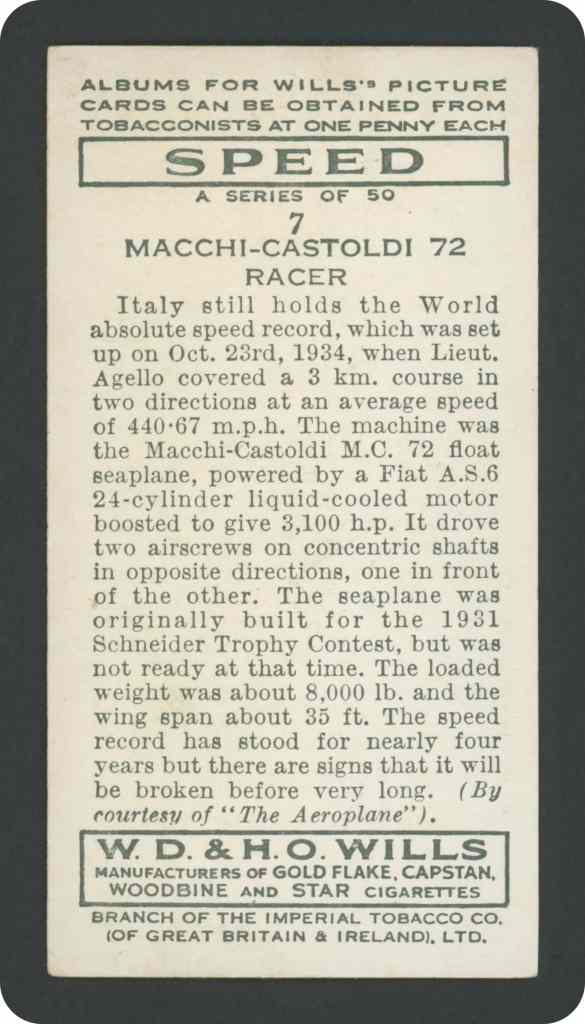 Italy still holds the World absolute speed record, which was set up on Oct. 23rd, 1934, when Lieut. Agello covered a 3 km. course in two directions at an average speed of 440•67 m.ph. The machine was the Macchi-Castoldi M.C. 72 float seaplane, powered by a Fiat A.S.6 24-cylinder liquid-cooled motor boosted to give 3,100 h.p. It drove two airscrews on concentric shafts in opposite directions, one in front of the other. The seaplane was originally built for the 1931 Schneider Trophy Contest, but was not ready at that time. The loaded weight was about 8,000 lb. and the wing span about 35 ft. The speed record has stood for nearly four years but there are signs that it will be broken before very long. (By courtesy of “The Aeroplane”).