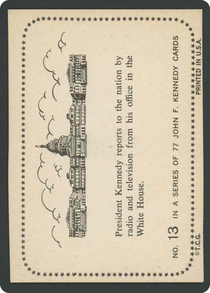 President Kennedy reports to the nation by radio and television from his office in the White House.