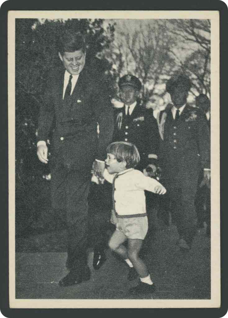 President Kennedy watches John Jr. as the young boy jumps happily along. The chief executive has just attended ceremonies at Arlington Cemetery.