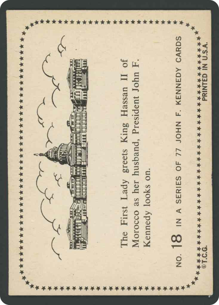 The First Lady greets King Hassan II of Morocco as her husband, President John F. Kennedy looks on.
