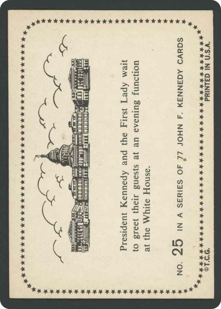 President Kennedy and the First Lady wait to greet their guests at an evening function at the White House.