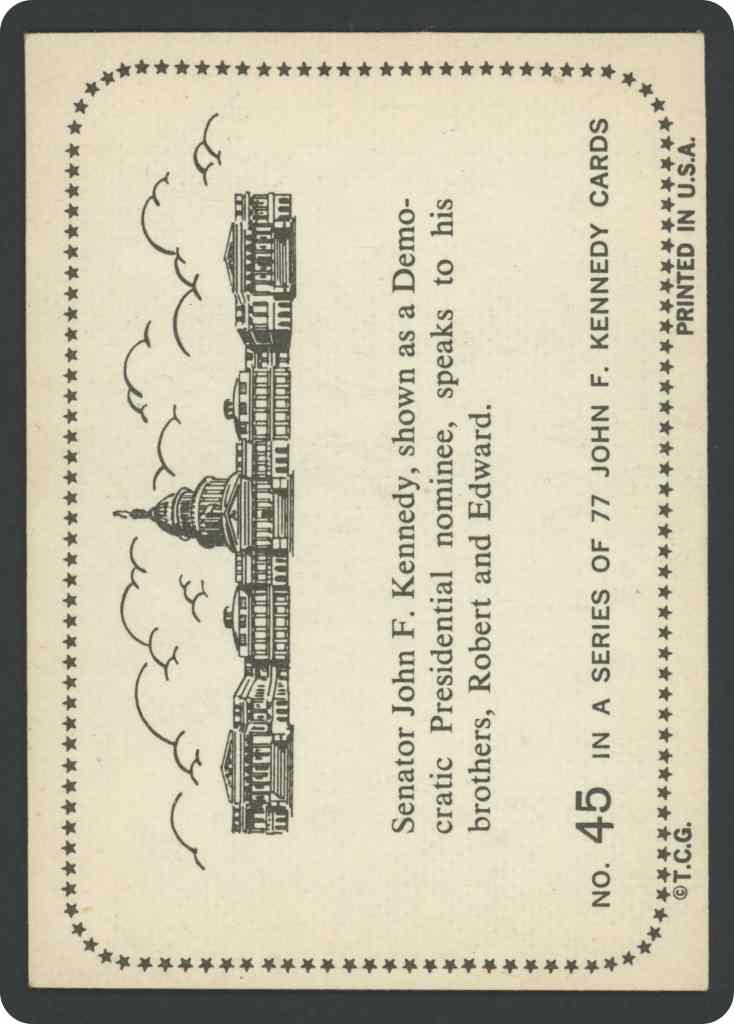 Senator John F. Kennedy, shown as a Democratic Presidential nominee, speaks to his brothers, Robert and Edward.