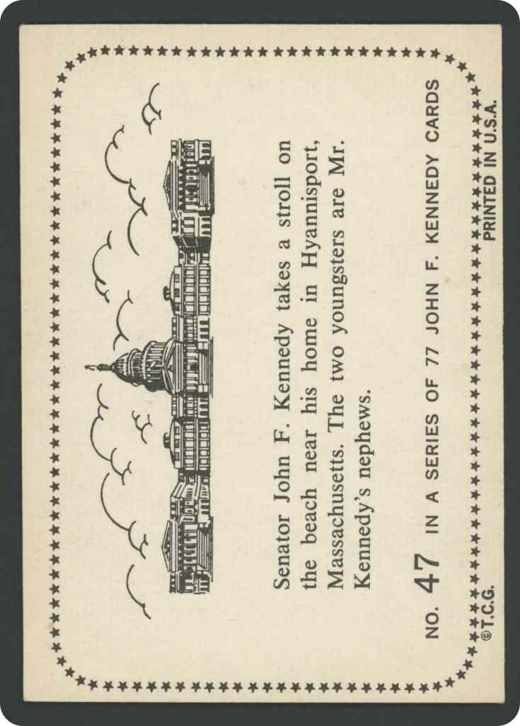 Senator John F. Kennedy takes a stroll on the beach near his home in Hyannisport, Massachusetts. The two youngsters are Mr. Kennedy’s nephews.