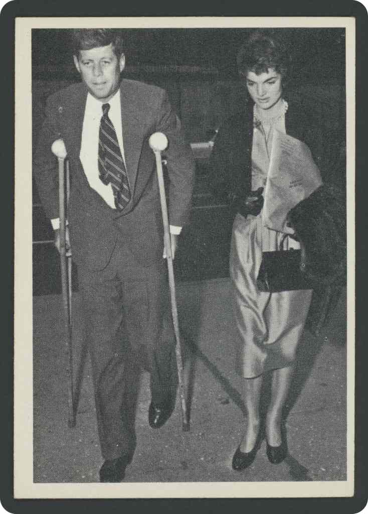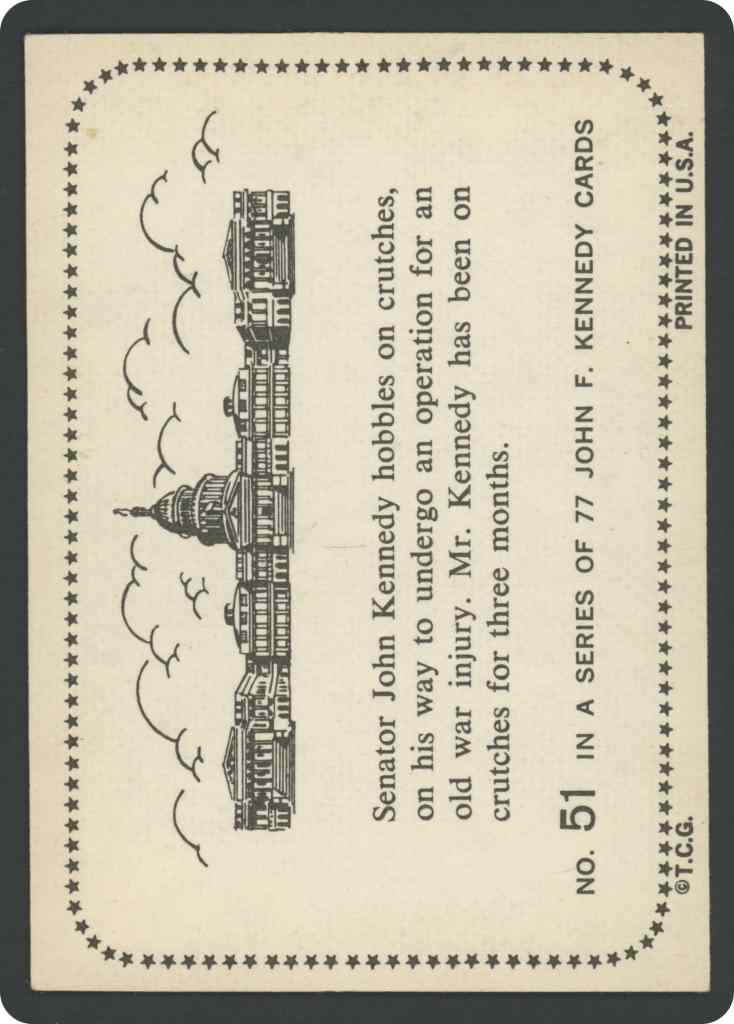 Senator John Kennedy hobbles on crutches, on his way to undergo an operation for an old war injury. Mr. Kennedy has been on crutches for three months.
