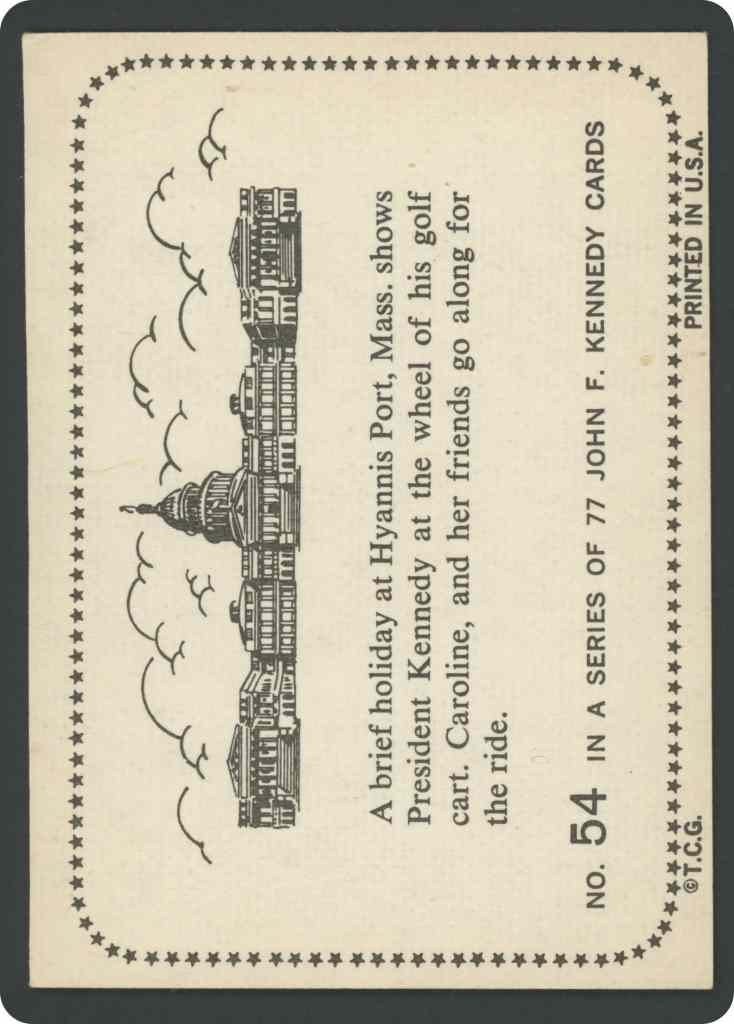 A brief holiday at Hyannis Port. Mass. shows President Kennedy at the wheel of his golf cart. Caroline, and her friends go along for the ride.