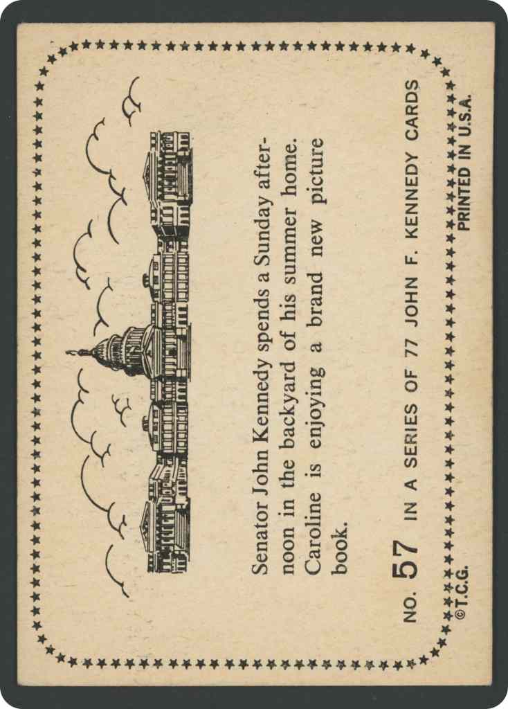 Senator John Kennedy spends a Sunday afternoon in the backyard of his summer home. Caroline is enjoying a brand new picture book.