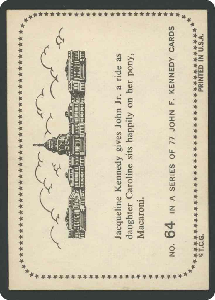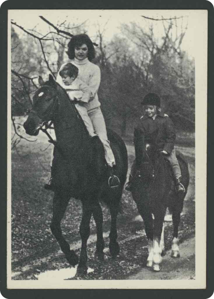 Jacqueline Kennedy gives John Jr. a ride as daughter Caroline sits happily on her pony, Macaroni.