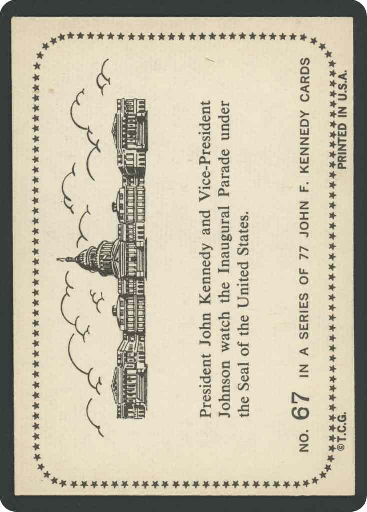 President John Kennedy and Vice-President Johnson watch the Inaugural Parade under the Seal fo the United States.