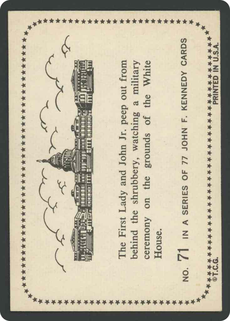 The First Lady and John Jr. peep out from behind the shrubbery, watching a military ceremony on the grounds of the White House.
