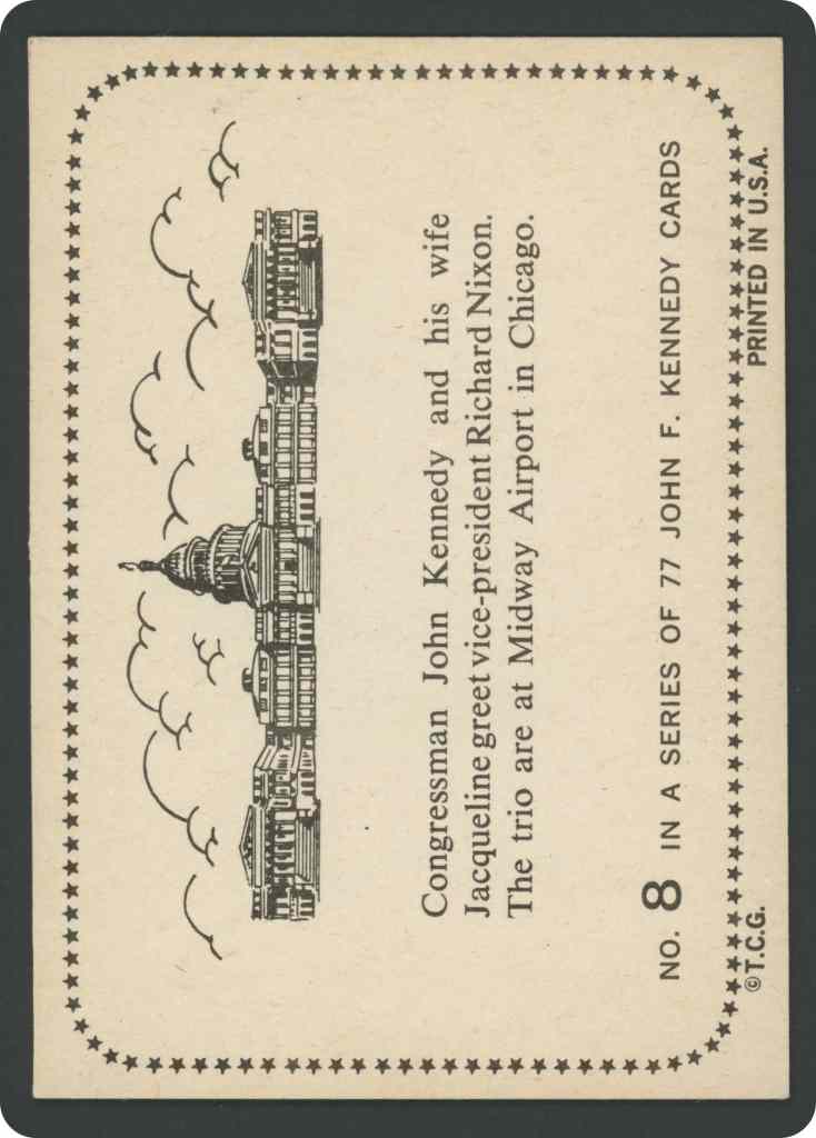 Congressman John Kennedy and his wife Jacqueline greet vice-president Richard Nixon. The trio are at Midway Airport in Chicago