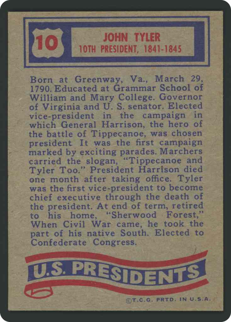 Born at Greenway, Va., March 29. 1790. Educated at Grammar School of William and Mary College. Governor of Virginia and U. S. senator. Elected vice prezident in the campaign in which General Harrison, the hero of the battle of Tippecanoe, was chosen president It was the first campaign marked by exciting parades. Marchers carried the slogan. “Tippecanoe: and Tvier Too; President Harrison died one month after taking office. Tyler was the hrst vice-president to beccome chief executive through the death of the president. At end of term, retired to his home, “Sherwood Forest, ”When Civil War came, he took the part of his native South. Elected to Confederate Congress.
