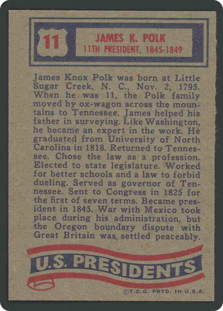James Knox Polk was born at Little Sugar Creek, N. C. Nov. 2, 1795. When he was 11, the Polk family moved by ox-wagon across the mountains to Tennessee. James helped his father in surveying. Like Washington, he became an expert in the work. He graduated from University of North Carolina in 1818. Returned to Tennessee. Chose the law as a profession. Elected to state legislature. Worked for better schools and a law to forbid dueling. Served as governor of Tennessee. Sent to Congress in 1825 for the first of seven terms. Became president in 1845. War with Mexico took place during his administration, but the Oregon boundary dispute with Great Britain was settled peaceably.