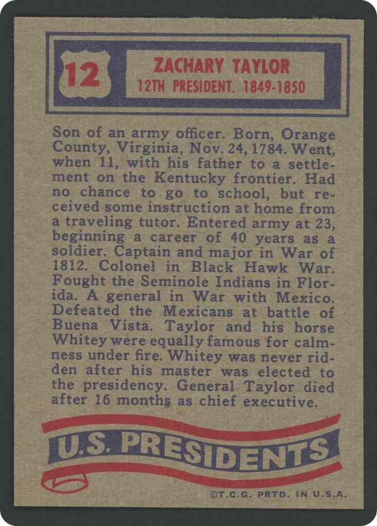Son of an army officer. Born, Orange County, Virginia, Nov. 24, 1784. Went, when 11, with his father to a settlement on the Kentucky frontier. Had no chance to go to school, but received some instruction at home from a traveling tutor. Entered army at 23, beginning a career of 40 years as a soldier. Captain and major in War of 1812. Colonel in Black Hawk War. Fought the Seminole Indians in Florida. A general in War with Mexico. Defeated the Mexicans at battle of Buena Vista. Taylor and his horse Whitey were equally famous for calmness under fire. Whitey was never ridden after his master was elected to the presidency. General Taylor died after 16 months as chief executive.