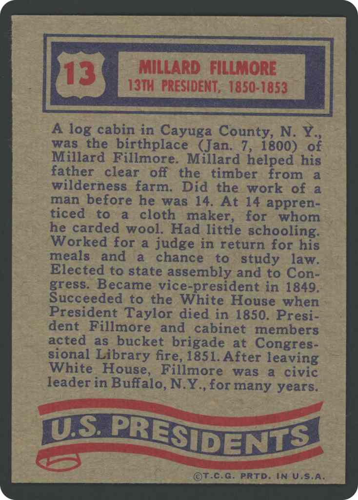 A log cabin in Cayuga County, N.Y. was the birthplace (Jan. 7, 1800) of Millard Fillmore. Millard helped his father clear off the timber from a wilderness farm. Did the work of a man before he was 14. At 14 apprenticed to a cloth maker, for whom he carded wool. Had little schooling. Worked for a judge in return for his meals and a chance to study law. Elected to state assembly and to Congress. Became vice-president in 1849. Succeeded to the White House when President Taylor died in 1850. President Fillmore and cabinet members acted as bucket brigade at Consressional Library fire, 1851. After leaving White House, Fillmore was a civic leader in Buffalo, N.Y., for many years.