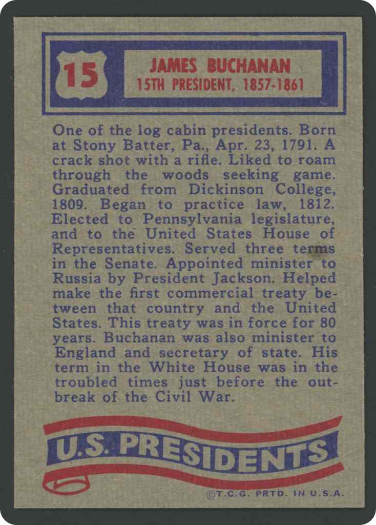 One of the log cabin presidents. Born at Stony Batter, Pa., Apr. 23, 1791. A crack shot with a rifle. Liked to roam through the woods seeking game. Graduated from Dickinson College, 1809. Began to practice law, 1812. Elected to Pennsylvania legislature, and to the United States House of Representatives. Served three terms in the Senate. Appointed minister to Russia by President Jackson. Helped make the first commercial treaty between that country and the United States. This treaty was in force for 80 years. Buchanan was also minister to England and secretary of state. His term in the White House was in the troubled times just before the out-break of the Civil War.