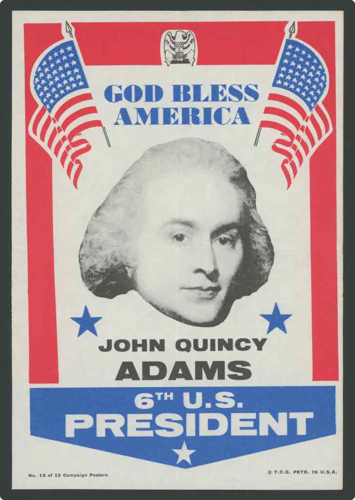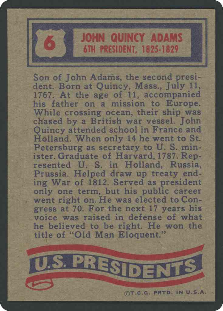 Son of John Adams, the second president. Born at Quiney, Mass., July 11, 1767. At the age of 11, accompanied his father on a mission to Europe. While crossing ocean, their ship was chased by a British war vessel. John Quincy attended school in France and Holland. When only 14 he went to St. Petersburg as secretary to U. S. minister. Graduate of Harvard, 1787. Represented U. S. in Holland, Russia, Prussia. Helped draw up treaty ending War of 1812. Served as president only one term, but his public career went right on. He was elected to Congress at 70. For the next 17 years his voice was raised in defense of what he believed to be right. He won the title of “Old Man Eloquent”.