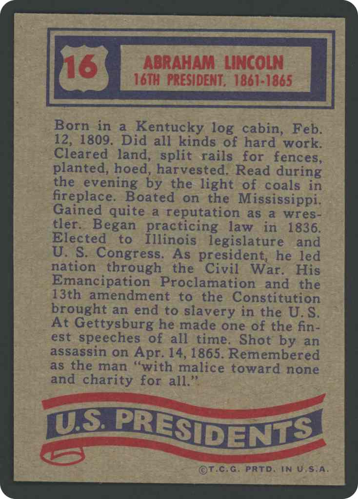 Born in a Kentucky log cabin, Feb. 12, 1809. Did all kinds of hard work. Cleared land, split rails for fences, planted, hoed, harvested. Read during the evening by the light of cosis in fireplace. Boated on the Mississippi. Gained quite a reoutation as a wrestler. Began practicing law in 1836. Elected to Illinois legislature and U. S. congress. As president, he led nation through the Civil War. His Emancipation Proclamation and the 13th amendment to the Consitution brought an end to slavery in the U.S At Gettysburg he made one of the finest speeches of all time. Shot by an assassin on Apr. 14, 1865. Remembered as the man “with malice toward none and charity for all.”