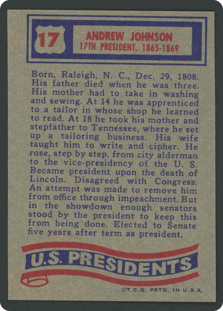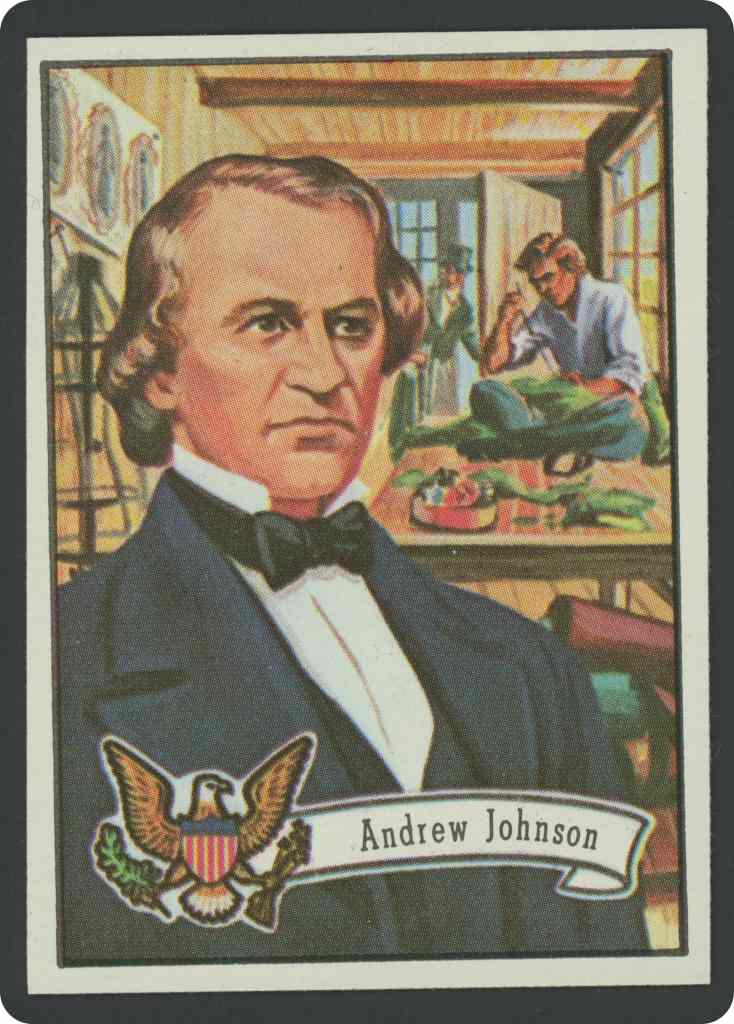 Born, Raleigh, N. C., Dec. 29, 1808. His father died when he was three. His mother had to take in washing and sewing. At 14 he was apprenticed to a tailor in whose shop he learned to read. At 18 he took his mother and stepfather to Tennessee, where he set up a tailoring business. His wife taught him to write and cipher. He rose, step by step, from city alderman to the vice-presidency of the U. S. Became president upon the death of Lincoln. Disagreed with Congress. An attempt was made to remove him from office through impeachment. But in the showdown enough senators stood by the president to keep this from being done. Elected to Senate five years after term as president.
